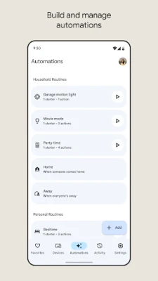 Pin your most-used devices, automations, and actions to the Favorites tab for easy access right when you open the app. View your Nest cameras and doorbell live feeds, and easily scan through event history. Set up and manage Routines in the Automations tab. And quickly edit any permissions in the consolidated Settings tab.